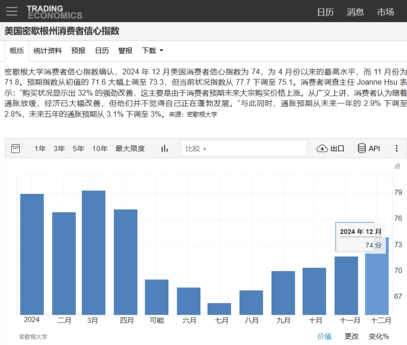 近日,密歇根大學消費者信心指數確認,今年12月美國消費者信心指數終值從11月的71.8升至74,是今年4月份以來的最高水平。與此同時,最新公布的數據還顯示,消費者對未來一年的通脹預期從2.9下降至為2.8%,對未來五到十年通脹率預期從3.1下調至3%。
