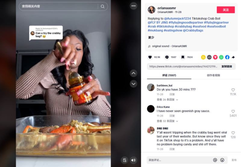 從TikTok到Instagram,從美食博主到意見領袖,Fly By Jing積極與各種社交平臺上的達人合作,通過短視頻、圖片等多種形式展示辣醬的多種搭配方法和美味口感。這種營銷策略不僅吸引了大量關注,還激發了消費者的購買欲望。目前,Fly By Jing的TikTok賬號已經擁有超過2萬粉絲,視頻播放量更是達到了500萬。