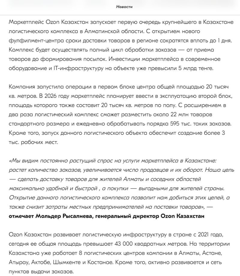 Ozon哈薩克斯坦公司總經理Molder Rysalieva表示,隨著訂單和賣家數量的持續增長,哈薩克斯坦市場對Ozon服務的需求不斷上升。該物流中心的啟動將大幅提高配送效率,降低企業供應成本,同時為居民提供更便利的購物體驗和經濟實惠的采購方案。