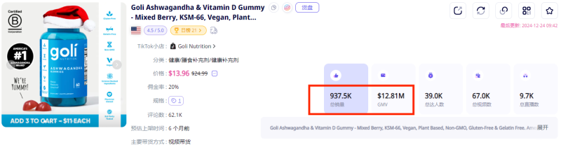 從今年8月開始,Goli Nutrition旗下的一款保健軟糖銷量持續(xù)上升,日均出單量達(dá)到3000件,銷量最好的時(shí)候甚至能一天賣出一萬單,輕松拿下10萬美金的日銷售額。進(jìn)入9月,產(chǎn)品銷量全面爆發(fā),在TikTok美區(qū)的保健類目榜和全品類榜單上,Goli Nutrition的產(chǎn)品及小店都能排進(jìn)前列。
