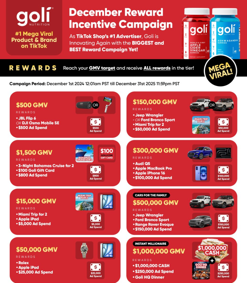 而相比Rosabella,Goli Nutrition的營銷策略更加簡單粗暴,從9月開始,Goli Nutrition就不斷給帶貨達(dá)人發(fā)獎(jiǎng)金激勵(lì)。馬上截止的12月激勵(lì)計(jì)劃里,最高的一項(xiàng)獎(jiǎng)金直接是百萬美元現(xiàn)金+價(jià)值2.5萬美金的廣告贊助+Goli官方的晚宴邀請(qǐng)。