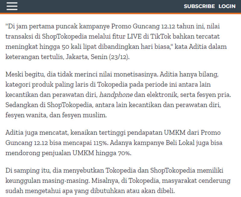 此外,隨著圣誕節(jié)到來(lái),相關(guān)商品如餅干、巧克力、圣誕樹(shù)及裝飾品等的訂單量平均增長(zhǎng)近三倍。Aditia指出,Shop Tokopedia的消費(fèi)者傾向于在TikTok上觀看視頻后再購(gòu)物,TikTok用戶(hù)的行為模式高度一致,92%的用戶(hù)會(huì)因視頻內(nèi)容而進(jìn)行購(gòu)物。數(shù)據(jù)顯示,Shop Tokopedia上在TikTok上直播的蠟染賣(mài)家與不直播的賣(mài)家相比,銷(xiāo)售額平均增長(zhǎng)了3倍。