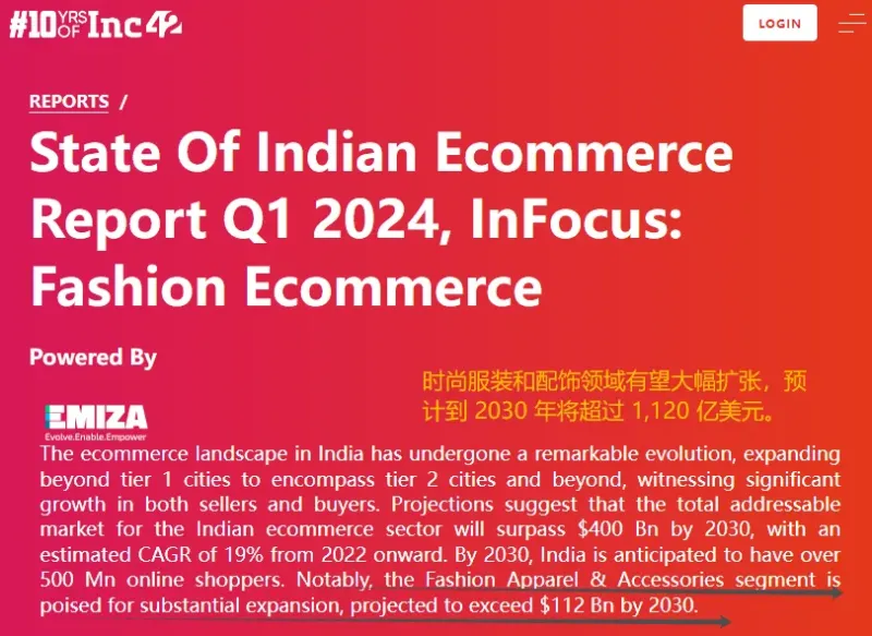 得益于印度龐大的人口紅利和年輕消費群體,時尚類目發展前景一片大好。Inc42發布的《2024年第一季度印度電商狀況報告》顯示,預計印度時尚電商領域將以25%的復合年增長率增長,到2030年市場價值超過1120億美元。