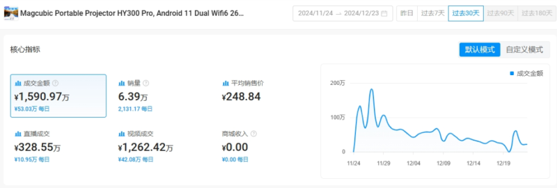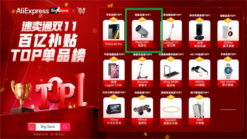 值得一提的是,TikTok并不是這款投影儀的唯一“陣地”,在其他跨境電商平臺同樣有布局,例如速賣通。據速賣通公布的跨境雙11百億補貼銷量數據顯示,雙11期間該投影儀便拿下了日銷超50萬美元的銷售成績,是平臺投影品類中的Top1。