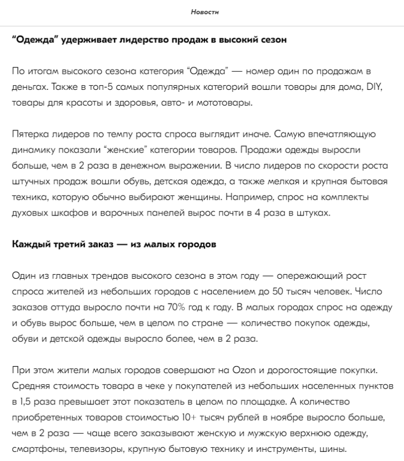 12月27日消息,Ozon近日發布銷售旺季總結,11月匯聚了雙11和黑色星期五兩大促銷活動,每年都會吸引創紀錄的訪客數量。今年11月,Ozon平臺吸引了近7500萬訪客,每兩個買家中就有一人購買時尚品類的商品;成交總額超過3500億盧布,其中92%的營業額來自企業家銷售。