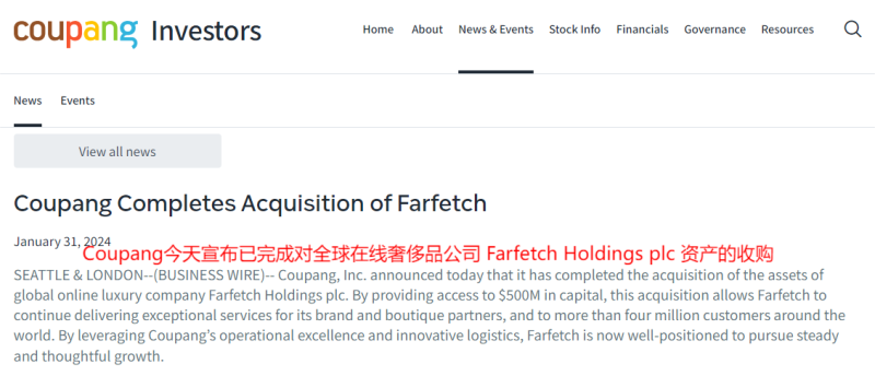 Coupang收購奢侈品平臺Farfetch 圖源:ir.aboutcoupang