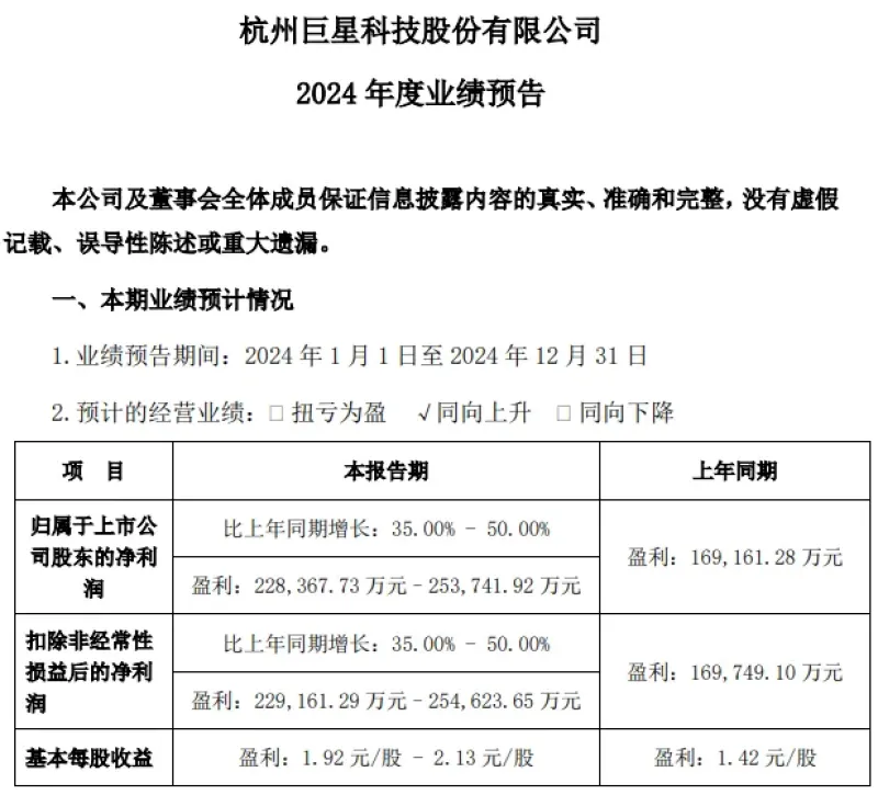 最近,巨星科技披露了2024年度業績預告。報告顯示,預計全年歸母凈利潤22.84億元-25.37億元,同比增長35%-50%;扣非歸母凈利潤22.92億元-25.46億元,同比增長35%-50%。