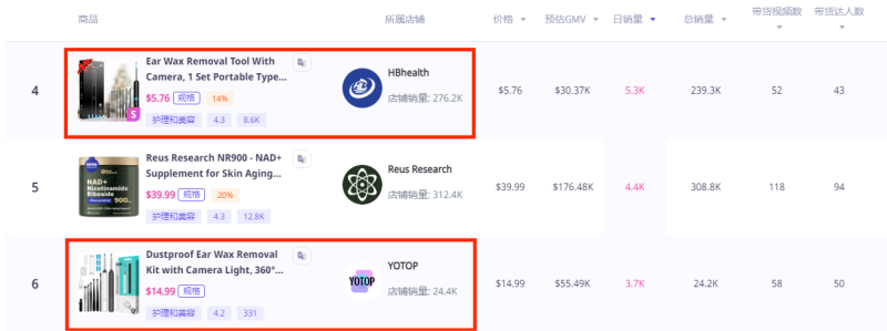 根據Echotik數據,這幾天,電動挖耳勺在TikTok美區掀起了一股購物熱潮,在圣誕節當天的熱銷榜上,有兩款電動挖耳勺闖進了銷量榜前列,一個排名第四,一個排名第六。