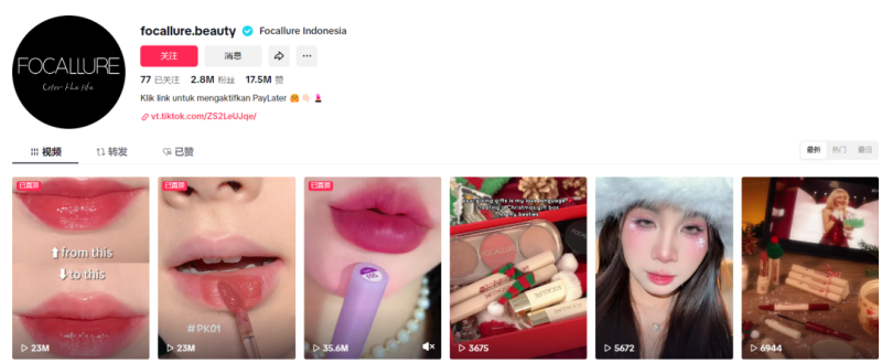彩妝品牌Focallure便是國貨出海的一大尖子生代表,多次上榜海外十大中國彩妝品牌。在TikTok上,Focallure的熱度爆表,主營東南亞的官方賬號粉絲數已經超過280萬,遙遙領先于很多彩妝品牌賬號。