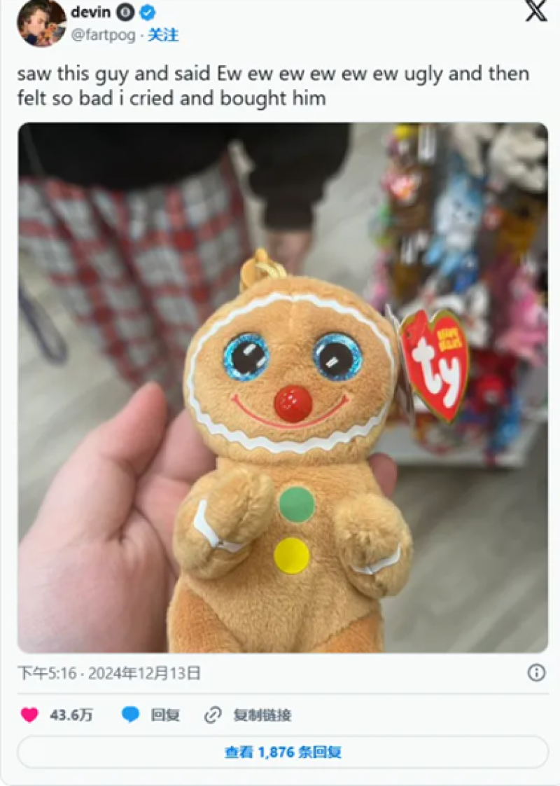 “無心插柳柳成蔭”,Sliva沒想到,帖子一經(jīng)發(fā)布就迅速走紅,短短幾天不到就收獲超2700萬次觀看,點贊量超43萬,越來越多人開始關(guān)注到這個丑萌的姜餅人玩具。