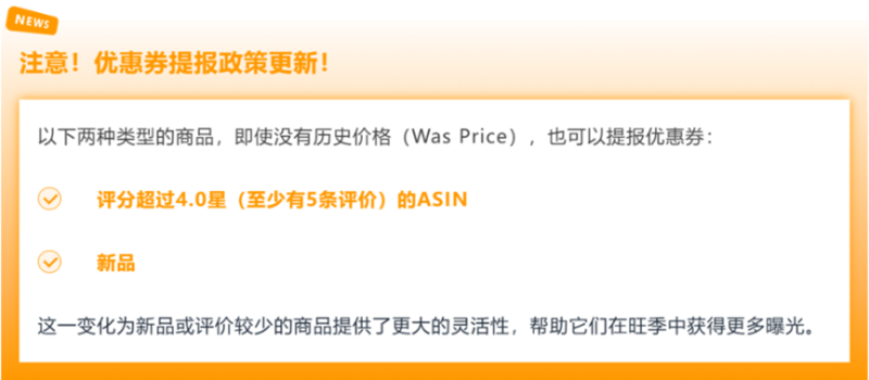后來可能是收到了太多新品賣家的反饋,亞馬遜又在11月份宣布去掉Coupon提報中對歷史價格的要求,規定評分超過4星且累積評論達5條以上的ASIN或者新品均可以優惠券提報。