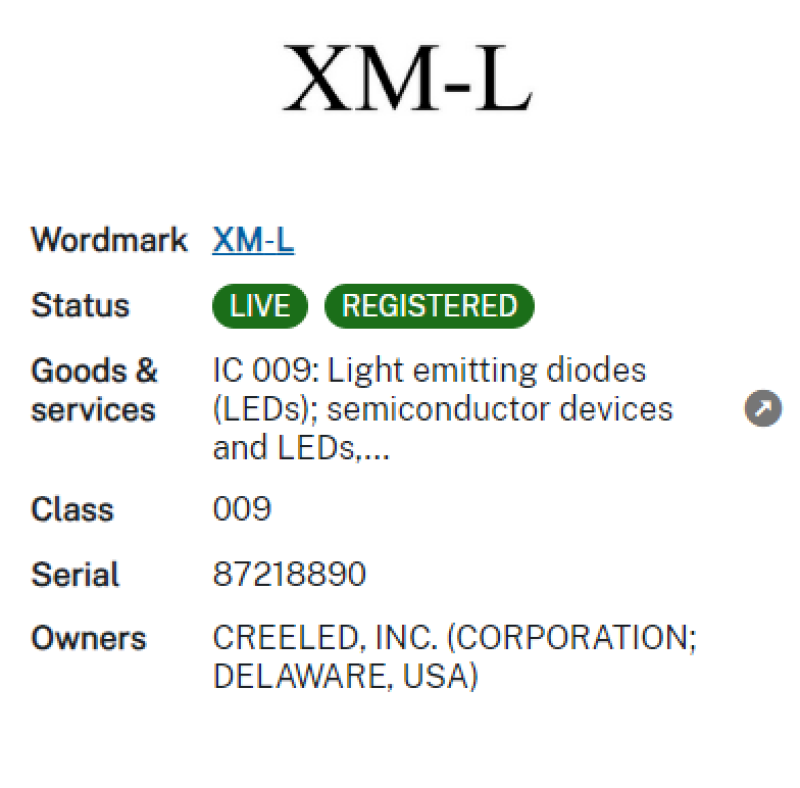 舉個例子,“XM-L”這一詞早在2017年就被美國一所燈具公司注冊成商標(biāo),序列號為87218890。而這是一個尺寸量詞,很多燈具類目賣家都會用它來表示尺寸型號,在亞馬遜美國站搜索“XM-L”,出現(xiàn)高達(dá)1萬多條搜索結(jié)果。