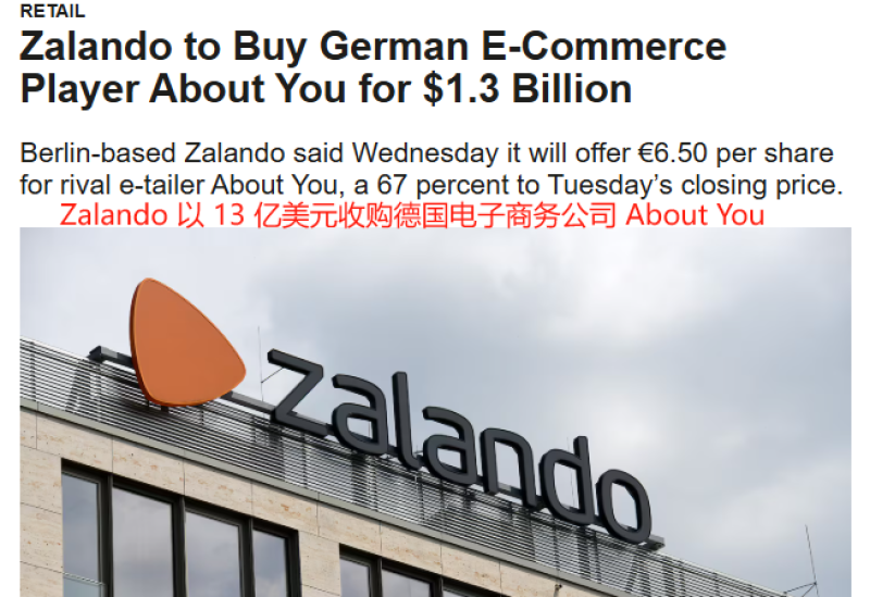不過(guò),Zalando的野心遠(yuǎn)不止于此。12月上旬,Zalando宣布將以12億歐元的價(jià)格收購(gòu)其競(jìng)爭(zhēng)對(duì)手About You,現(xiàn)金報(bào)價(jià)相當(dāng)于每股6.5歐元,比About You近3個(gè)月平均股價(jià)高出107%。預(yù)計(jì)明年夏季,這項(xiàng)收購(gòu)工作將順利完成。