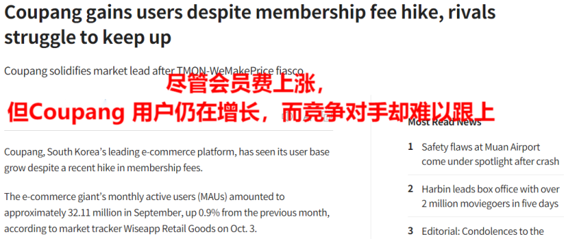 Coupang會(huì)員費(fèi)上漲 圖源:chosun