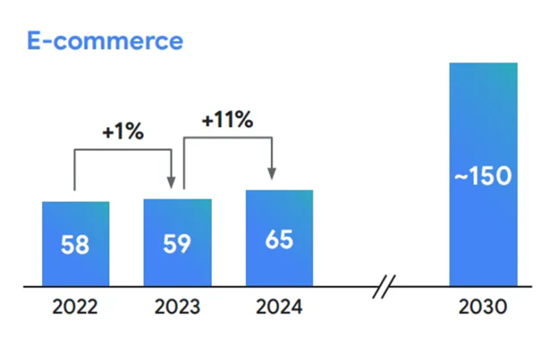 除了上文提到的印度,東南亞也是近來比較受關(guān)注的一個(gè)潛力電商市場(chǎng)。根據(jù)去年11月谷歌、淡馬錫和貝恩公司公布的一份《2024年?yáng)|南亞數(shù)字經(jīng)濟(jì)報(bào)告》,早在2023年,東南亞的電商GMV就已經(jīng)達(dá)到了1380億美元,而2024年這一數(shù)字預(yù)估增長(zhǎng)到了1590億美元,同比漲幅約為15%。這其中,印尼是最大的細(xì)分市場(chǎng),2024年其電商規(guī)模預(yù)計(jì)為650億美元,同比增長(zhǎng)了11%。