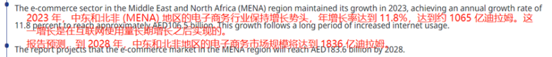 以及中東和北非電商市場(chǎng)。一份來自EZDubai和歐睿國(guó)際的數(shù)據(jù)顯示,早在2023年,中東和北非電商市場(chǎng)規(guī)模就已經(jīng)達(dá)到了1065億阿聯(lián)酋迪拉姆(約合290億美元),而到2028年時(shí),這一數(shù)字預(yù)計(jì)會(huì)增長(zhǎng)到1836億迪拉姆(約合500億美元),復(fù)合年增長(zhǎng)率約為11.6%。