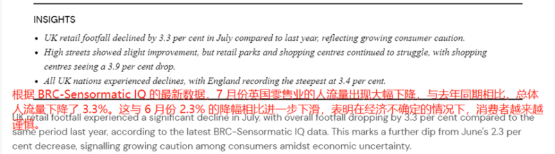 在持續(xù)性的通貨膨脹的沖擊下,英國消費(fèi)者生活成本上升,為了省錢紛紛勒緊褲腰帶、縮減購物開支,零售市場(chǎng)由此顯現(xiàn)出疲態(tài)。根據(jù)研究機(jī)構(gòu)BRC-Sensormatic IQ公布的數(shù)據(jù),今年6月英國零售市場(chǎng)客流量同比下滑2.3%,7月繼續(xù)同比下滑3.3%,這已經(jīng)該國零售市場(chǎng)客流量連續(xù)第12個(gè)月下滑了。