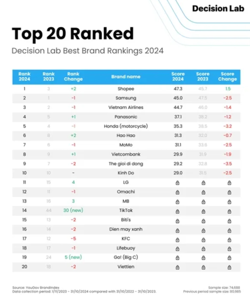 近日,YouGov與Decision Lab聯(lián)合發(fā)布了越南2024最佳品牌排名報告,該排名使用?YouGov BrandIndex 的專有指數(shù)分?jǐn)?shù),通過印象、質(zhì)量、滿意度、推薦和聲譽等多項關(guān)鍵指標(biāo)來評估品牌健康狀況。其中,Shopee在這份榜單中強勢登頂,取代三星成為越南消費者最認(rèn)可的品牌。