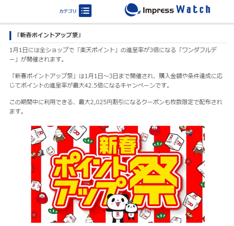 同時,1月1日,所有店鋪將舉辦樂天積分獎勵率增加三倍的Wonderful Day活動;1月1日-3日期間還將舉行“新年積分提升節”,根據購買金額和滿足條件,積分獎勵率最高可達42.5倍。除了積分獎勵外,樂天還將發放數量有限的優惠券,用戶最高可享2025日元的抵扣。