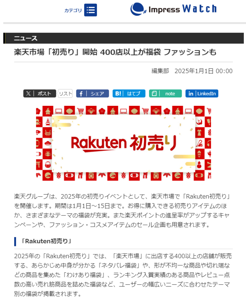 1月2日消息,日本電商巨頭樂天(Rakuten)將于2025年1月1日-15日舉辦2025年首個大型促銷活動Rakuten First Sale,提供福袋商品與多項優惠。此次促銷活動吸引了超過400家商店參與,推出了多種類型的福袋,滿足消費者的多樣化需求。其中包括內容公開的劇透福袋、裝有邊角料或形狀不規則商品的福袋,以及裝滿高排名和暢銷商品的福袋,為用戶帶來驚喜體驗。