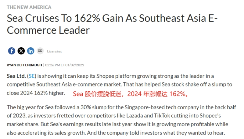 近日,有數據顯示,新加坡科技公司Sea Ltd.在經歷2023年的挑戰后,在Shopee平臺的強勁增長下,Sea股價在2024 年上漲了162 %。