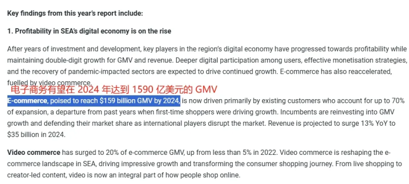 說到Shopee,自然就繞不開東南亞電商市場。據谷歌、淡馬錫和貝恩公司發布的《2024年東南亞數字經濟報告》顯示,2023年東南亞電商GMV為1380億美元,2024年則有望達1590億美元,折合人民幣約1.14萬億元。?