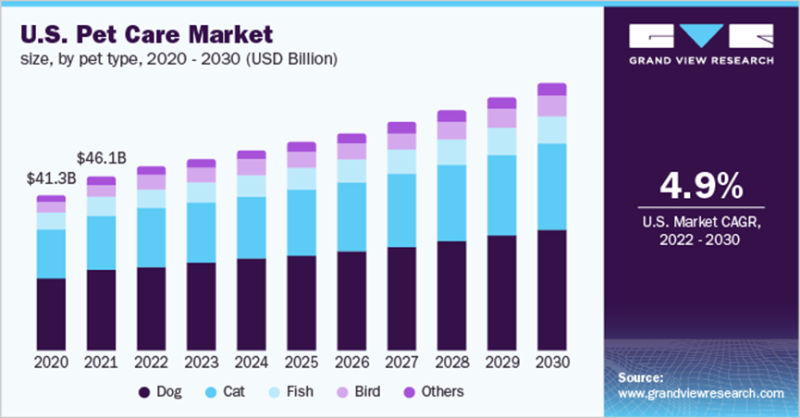 根據(jù)Grand View Research提供的數(shù)據(jù),2021年,全球?qū)櫸镒o(hù)理市場(chǎng)的規(guī)模為1506.7億美元,2022年—2030年期間,這一市場(chǎng)的規(guī)模會(huì)以5.1%的復(fù)合年增長(zhǎng)率 (CAGR) 不斷擴(kuò)大。而根據(jù)Zion Market Research提供的數(shù)據(jù),到2030年時(shí),全球?qū)櫸镒o(hù)理市場(chǎng)的規(guī)模有望增長(zhǎng)到驚人的3631.9億美元。