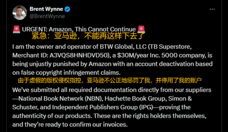 就在上個月,一位名叫Brent Wynne的亞馬遜賣家就在社交媒體上發文,稱遭到了亞馬遜不公平處罰,旗下年營收3000萬美金的賬戶在網一大促期間被封,損失慘重。