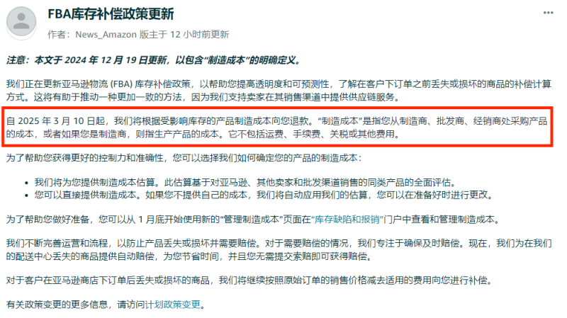 再往后點,亞馬遜FBA新賠付政策也將正式生效。據亞馬遜美國站公告,2025年3月10日起,若在FBA流程中發生庫存丟失等問題,平臺將按照產品的制造成本進行賠付,即賣家從制造商、批發商、經銷商處采購產品的成本,不包括賣家運往亞馬遜倉庫所需的運費、手續費、關稅等銷售成本。而此前,這項政策的執行標準是按銷售價格賠付。