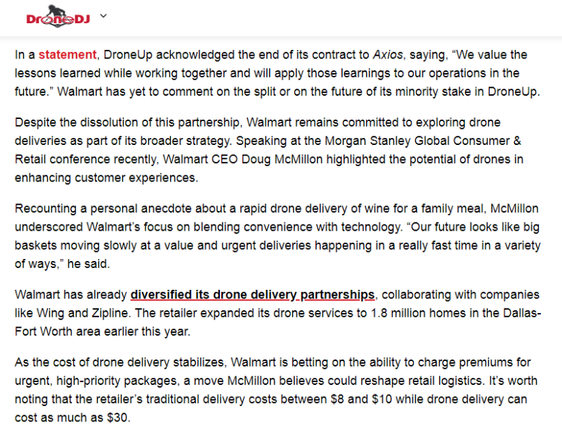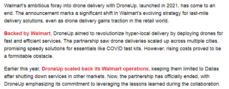 1月7日消息,沃爾瑪已終止與無人機物流供應商DroneUp的合作,包括剝離其在該公司的股份,標志著沃爾瑪將在無人機送貨方式上做出重大轉變。沃爾瑪與DroneUp的合作始于2021年,在沃爾瑪的支持下,DroneUp部署無人機提供快速配送服務,并在多個城市推廣,提供必需品的快速運輸解決方案。