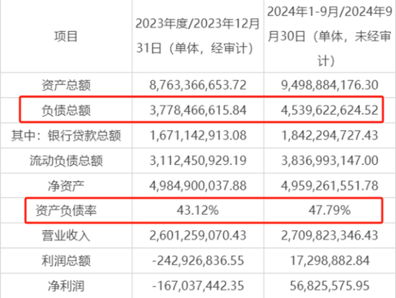 具體來說,數據指出,2023年格力博資產總額達到87.63億元,負債總額37.78億,資產負債率達到了43.12%。進入2024年后,格力博的負債情況并沒有緩解,反而在前三個季度將負債率進一步拉高至47.79%,負債總額達到45.40億元,其中銀行貸款總額超18億,流動負債總額近40億。