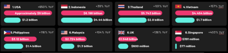 其中,美國市場收入占比最高,達到約90億美元其次是印尼和泰國,分別為62億美元和57.4億美元。其余市場,越南收入44.5億美元、菲律賓收入31.2億美元、馬來西亞收入27.2億美元、英國收入15.5億美元、新加坡收入3.91億美元。