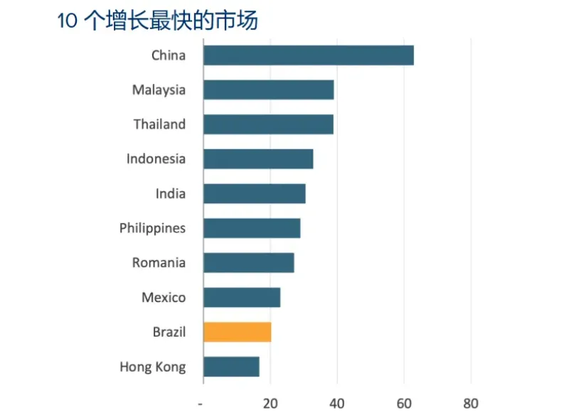 其中增長最快的十個市場分別為中國、馬來西亞、泰國、印度尼西亞、印度、菲律賓、羅馬尼亞、墨西哥、巴西和中國香港。