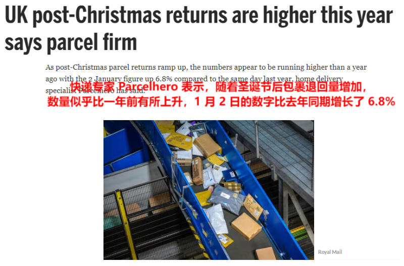 英國快遞服務(wù)公司Parcelhero的數(shù)據(jù)也印證了這一退貨趨勢。Parcelhero表示,目前有價值大約15.1億英鎊的服裝、電器、玩具等商品正在運回至零售商處。1月2日當天,退貨包裹數(shù)量出現(xiàn)明顯高峰,相比去年同期增長了6.8%。