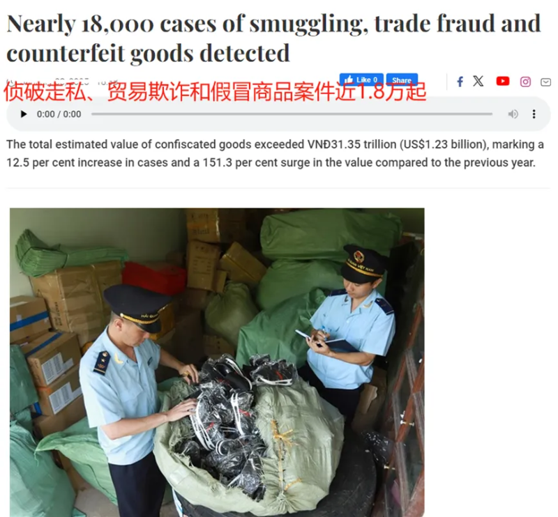 舉例來說,前幾日越南海關總局便發布消息稱,過去一年,海關當局共計偵破近18000起涉及走私、貿易欺詐和假冒商品的案件,查獲非法貨物總價值超過31.35萬億越南盾,相比2023年,偵破的案件數量同比增加了12.5%,查獲的非法商品總價值也同比飆升了151.3%,取得了重大突破。