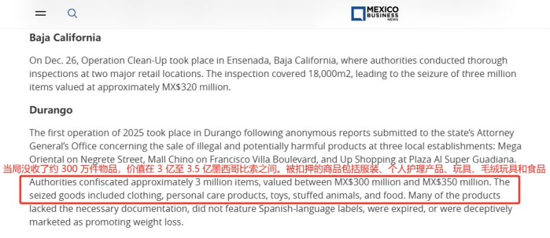 根據墨西哥經濟部的報告顯示,本次行動涉及超過300萬個非法商品,包括食品、玩具、服裝、化妝品等多種商品,其中很多都缺乏必要的文件,例如不符合墨西哥標簽、產品的有效期不可見或過期產品,或者被誤導性地宣傳為有助于減肥的功效,存在嚴重的安全隱患。