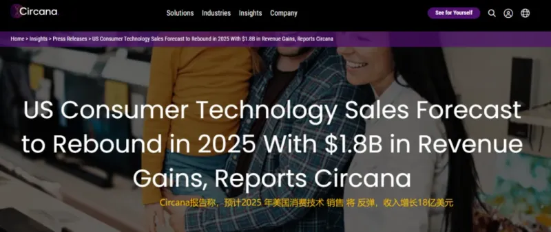 Circana最新報告顯示,預計2025年美國消費電子產品銷售收入將增長1.6%,增加約18億美元。初步結果表明,預計2024年消費電子銷售額同比下降1.3%,相比過去兩年下降速度明顯放緩,標志著消費電子行業正逐步回暖。