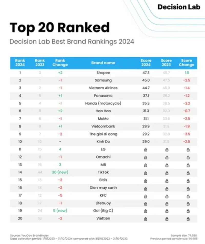 在東南亞地區的電商平臺中,Shopee一直走在前列,同時也收獲了許多消費者的喜愛和支持。據此前YouGov與Decision Lab聯合發布的越南2024最佳品牌排名報告顯示,Shopee已強勢登頂,取代三星成為越南消費者最認可的品牌。