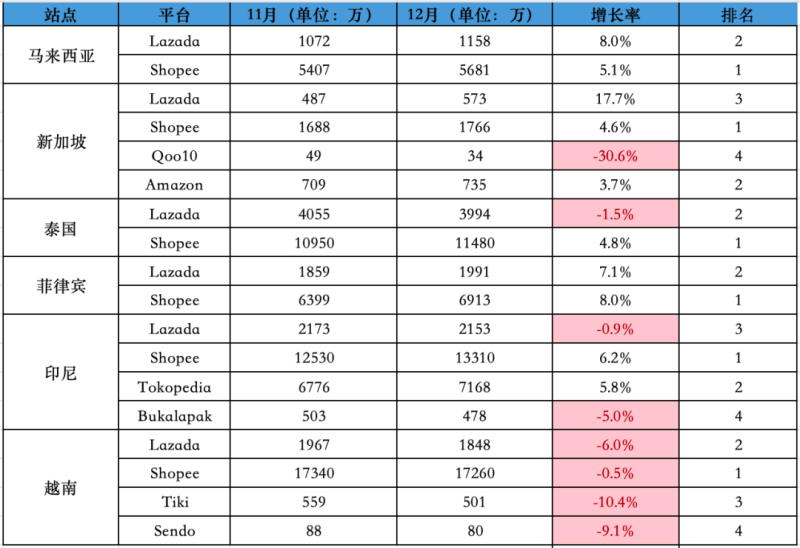 值得注意的是,在12月的東南亞市場,除了Shopee外,Lazada的表現也較為突出,特別是在菲律賓站、馬來西亞站、新加坡站,訪問量分別增長了7.10%、8.02%和17.65%。