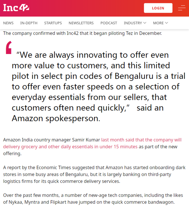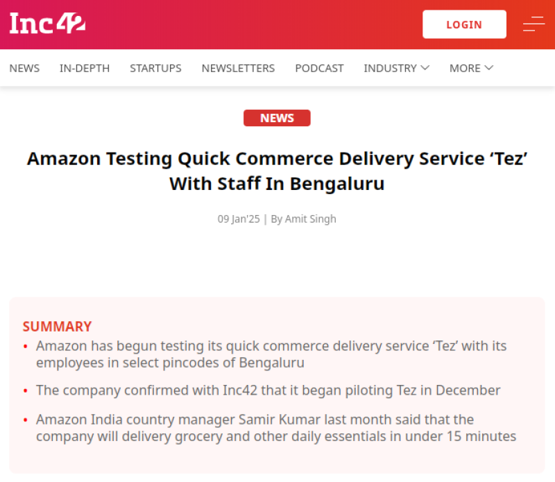 1月11日消息,亞馬遜已開(kāi)始在印度班加羅爾部分街區(qū)測(cè)試快速商務(wù)配送服務(wù)Tez。知情人士透露,該服務(wù)目前在班加羅爾總部及周邊部分區(qū)域內(nèi)運(yùn)營(yíng)Tez,試點(diǎn)類別涵蓋雜貨和其他家庭必需品,配送服務(wù)主要依賴第三方物流。亞馬遜于去年12月開(kāi)始測(cè)試該服務(wù),亞馬遜發(fā)言人表示,這項(xiàng)小規(guī)模試點(diǎn)旨在為客戶提供更快速的日常必需品配送服務(wù),以滿足高頻需求。