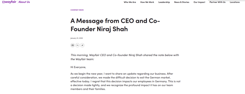 Wayfair自15年前進(jìn)入德國(guó)市場(chǎng)以來(lái),雖然德國(guó)是其在歐洲的首批市場(chǎng)之一,但業(yè)績(jī)一直落后于英國(guó)市場(chǎng)。公司首席執(zhí)行官Niraj Shah在致員工的信中表示,經(jīng)過(guò)最新評(píng)估,他們認(rèn)為在德國(guó)實(shí)現(xiàn)市場(chǎng)領(lǐng)先的增長(zhǎng)率將是一項(xiàng)漫長(zhǎng)而昂貴的努力,且潛在回報(bào)不如其他市場(chǎng)。