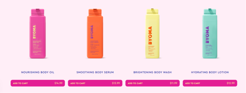 除了這類常規營銷,賣家也可以通過其他方式來吸引消費者注意,比如產品包裝。在年輕的護膚品牌里,Byoma走的就是這種路子,其包裝多采用鮮艷的顏色設計,在各大社媒平臺上吸引了不少年輕受眾。