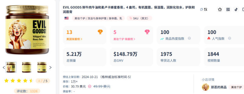 據了解,這款牛脂護膚膏來自evilgoods小店,上架時間大約在2024年10月下旬,而且全店目前只有這一個商品。在短短兩個多月的時間里,其累計銷量就突破了5萬件,預估總銷售額達到148.79萬美元。