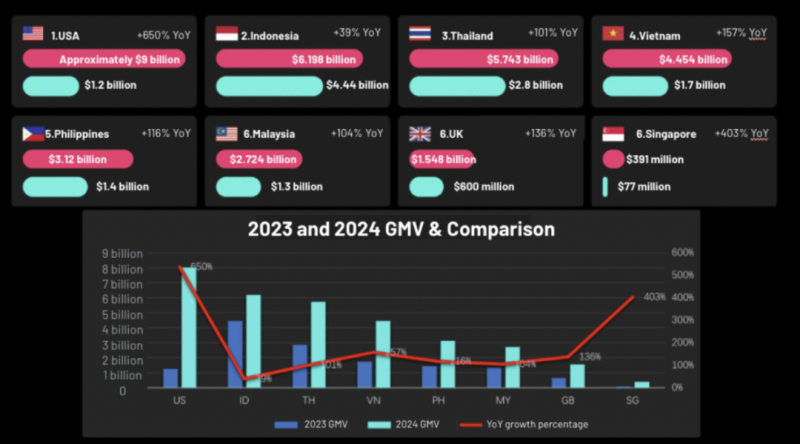 根據視頻商務數據分析公司Tabcut的數據,2024年,TikTok Shop的全球交易總額(GMV)達到約326億美元,同比暴漲650%。其中美國是最大的市場,貢獻了約90億美元的GMV。在平均訂單價值上,美國市場為19.64美元,是印尼和馬來西亞的4倍。