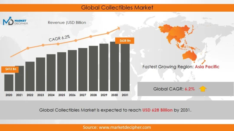 市場研究機構Market Decipher發布的《收藏品市場報告》顯示,全球收藏品市場將迎來爆炸式增長,2022年市場規模達到4580億美元,這一數字有望在2033年破萬億美元大關。