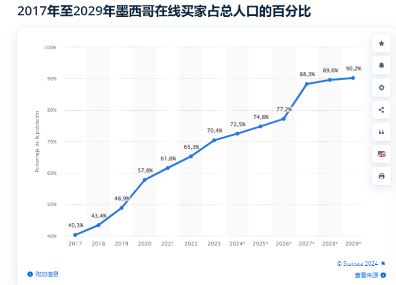 亞馬遜之所以會如此看中墨西哥市場,是因為該市場的確有著極大地發展潛力。據Statista數據顯示,預計在2024年至2029年期間,墨西哥市場將保持17.7%的年復合增長率,在線買家的比例更是瘋漲,有望達到驚人的90.2%。?
