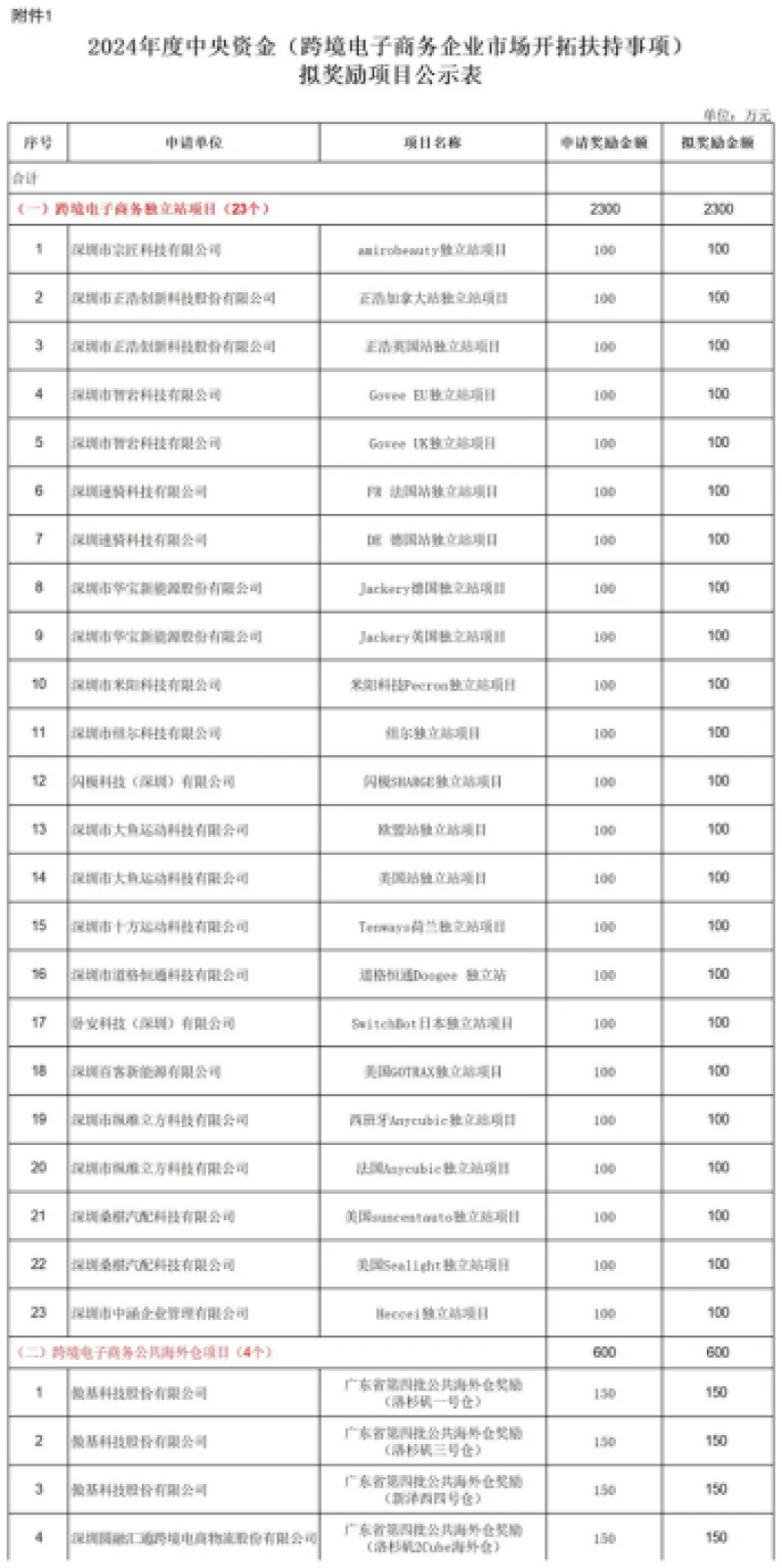 前陣時間,深圳商務局在公布的《2024年度中央資金(跨境電子商務企業市場開拓扶持事項)擬獎勵項目公示表》中表示,要給一批企業發放總計2900萬元的獎勵資金,最高的獲得了150萬元獎勵金。在這份獲獎名單里,共有16家深圳跨境電商企業的23個獨立站、4個跨境電子商務公共海外倉項目。智巖科技、閃極科技、傲基科技等跨境頭部玩家均上了榜單。
