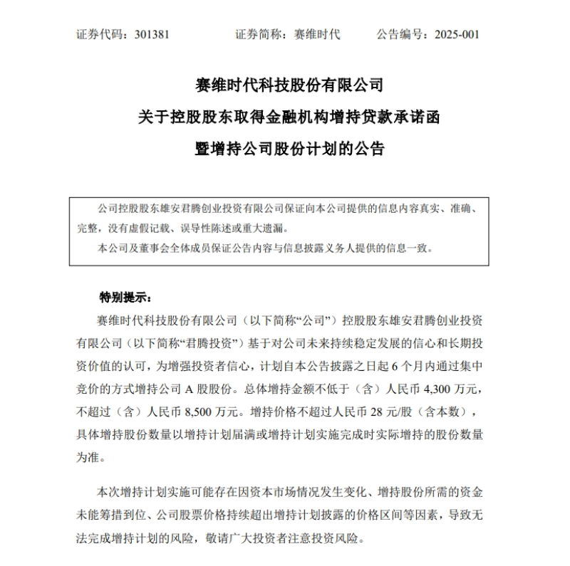 近日,賽維時代發布公告稱,公司控股股東雄安君騰創業投資有限公司(后文簡稱“君騰投資”)計劃自本公告披露之日起6個月內,通過集中競價的方式增持公司A股股份,總體增持金額不低于(含)人民幣4300萬元,不超過(含)人民幣8500萬元。