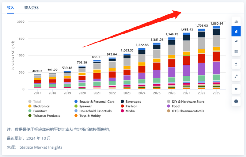 一方面,美國電商市場當前依然保持著穩定的增長勢頭,商機不斷涌現。根據Statista提供的數據,2025年,美國電子商務市場的收入預計將達到驚人的13820億美元。2025-2029年期間,這一市場還將持續擴大,預計符合年增長率(CAGR)為 8.01%。到2029年時,該市場的規模預計會增至18810億美元,用戶數量將達到3.335億,電商用戶滲透率也將增至97.1%。