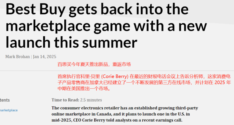 近日,有消息稱零售業巨頭百思買計劃于今年年中重返美國電商市場,推出一個全新的第三方在線銷售平臺。該公司首席執行官Corie Barry表示:“我們在加拿大擁有成熟且不斷發展的第三方在線市場,并計劃于2025年年中在美國推出一個。”